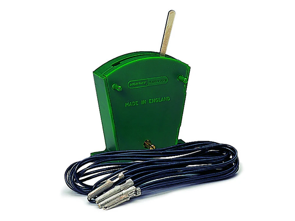 Dieser grüne Zwei-Wege-Hebelschalter verfügt über einen konventionellen Ein/Aus-Schalter für das R618-Doppelisoliergleis. Er wird auch mit Anschlussdrähten geliefert.