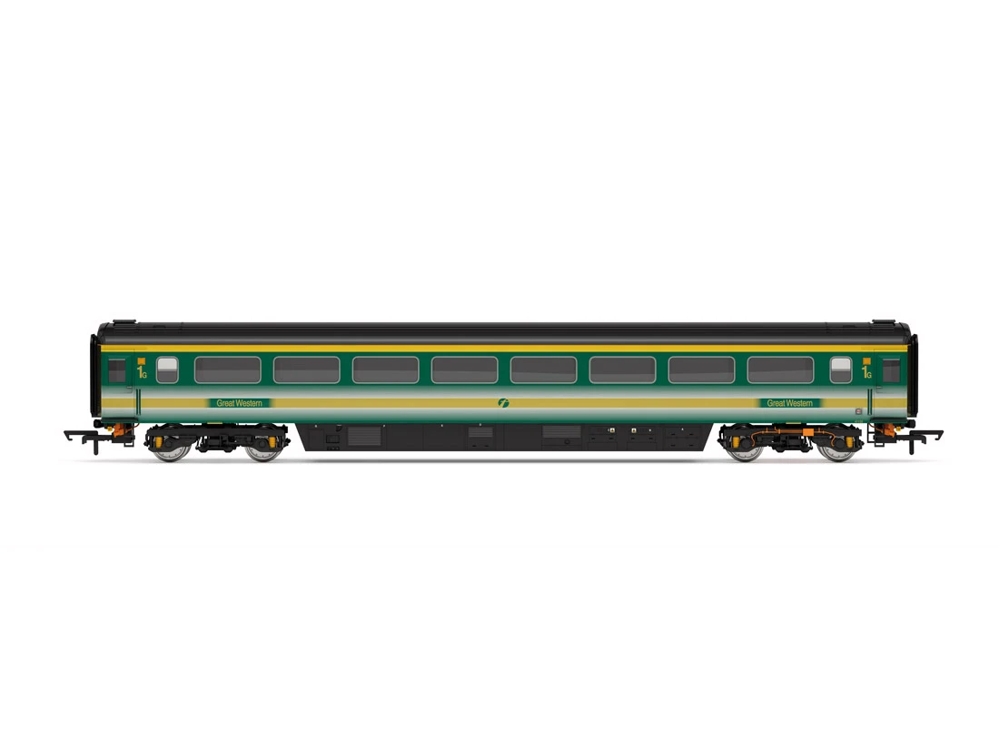 Modell: Spur 00 Gleichstrom. Personenwagen Mk3 als TFO Class Coach C der First Great Western. Ausgestattet mit Inneneinrichtung, NEM Kupplungsaufnahmen, englischen Hakenkupplungen.