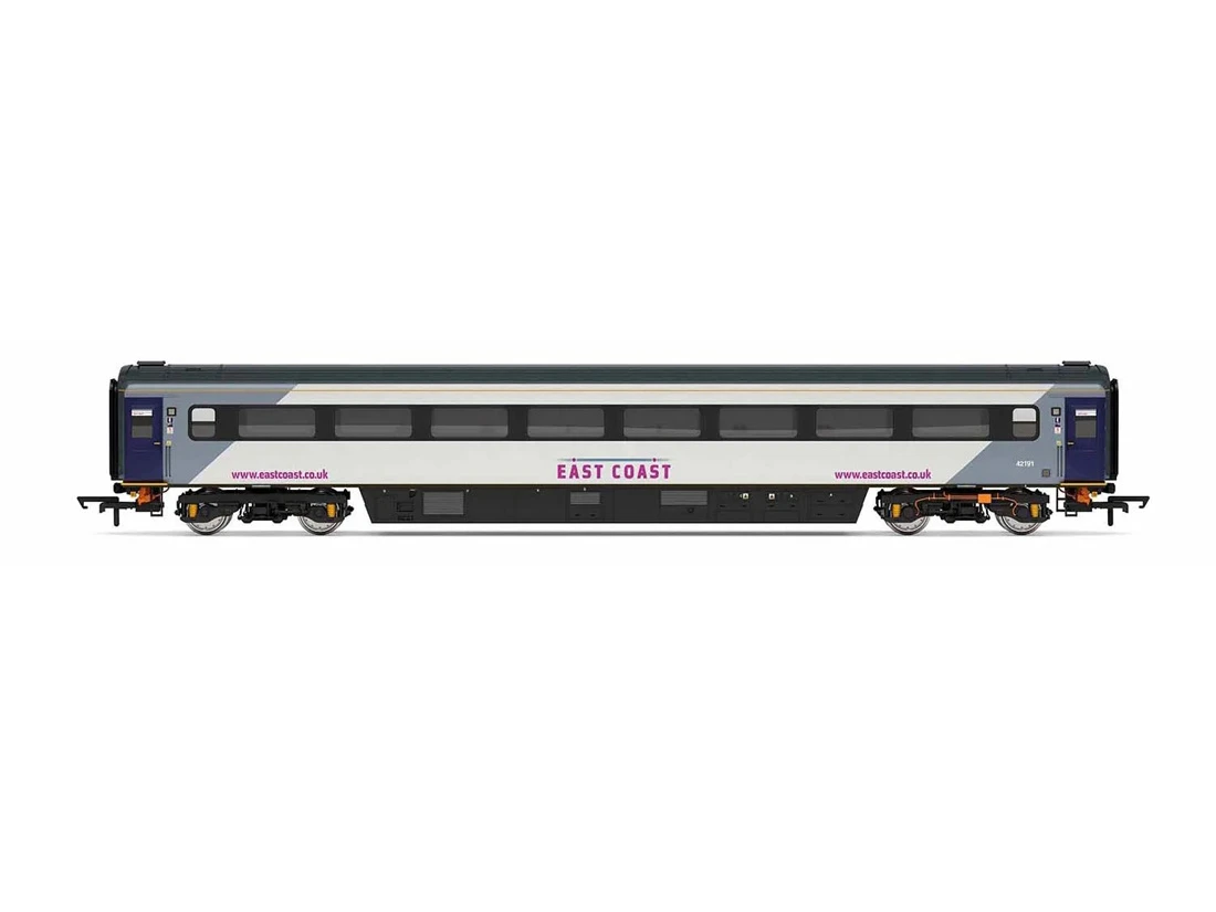 Modell: Spur 00 Gleichstrom. Personenwagen Mk3 als Trailer Standard in den Farben der East Coast. Ausgestattet mit Inneneinrichtung, NEM Kupplungsaufnahmen, englischen Hakenkupplungen.