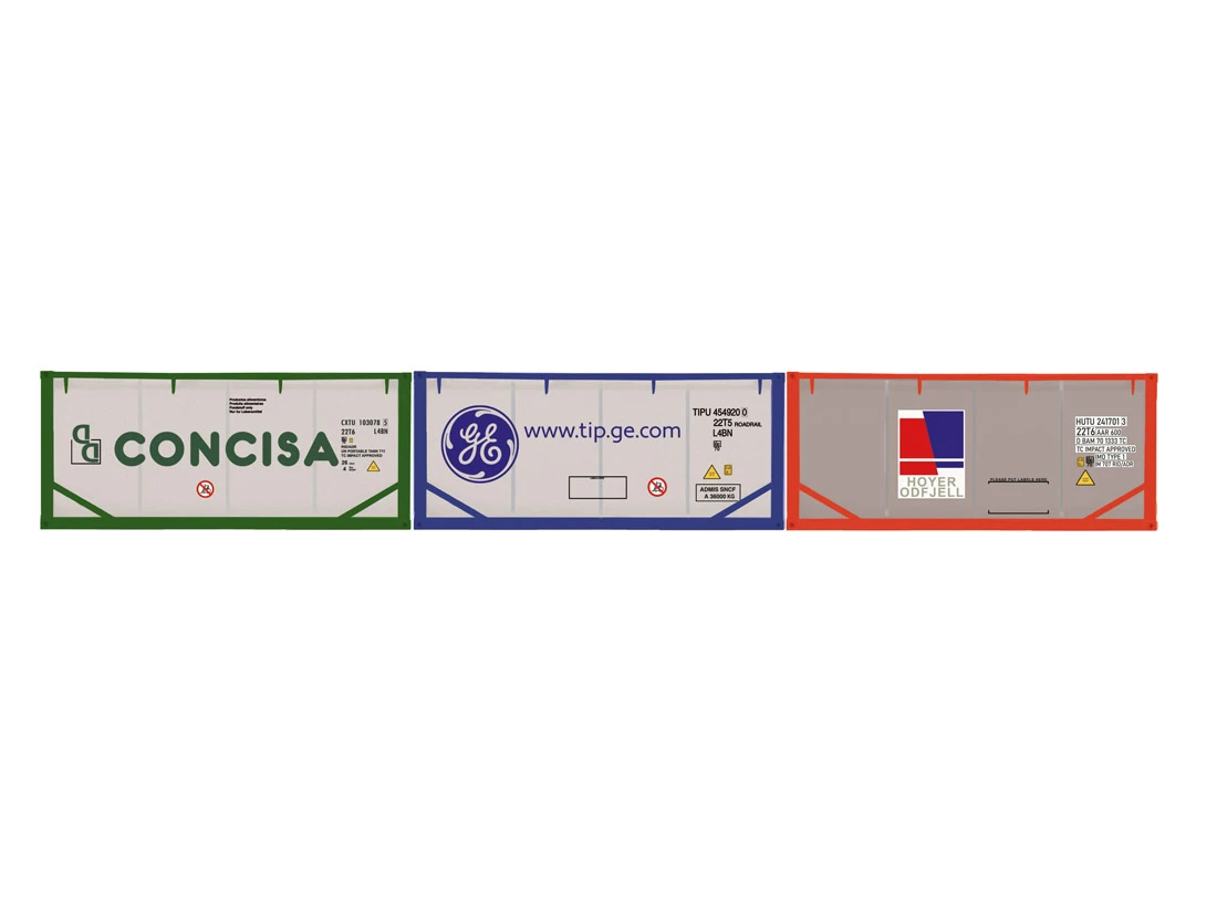 Modell: Spur 00. Containerset mit 3 unterschiedlich gestalteten 20′ Tankcontainern.