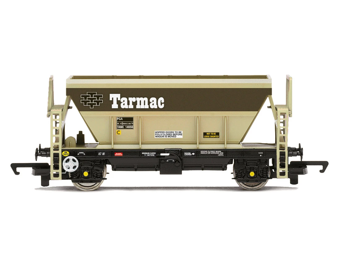 Modell: Spur 00 Gleichstrom. Modell eines Kippwagens zum Transport von Schotterprodukten wie Kies oder Sand. Er ist grau und trägt das Logo von Tarmac Quarry Products, einem britischen Unternehmen, das Schotterprodukte für die Bauindustrie liefert.
